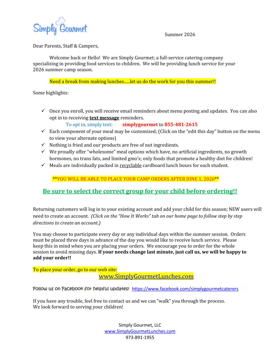 Simply Gourmet - Parent Letter