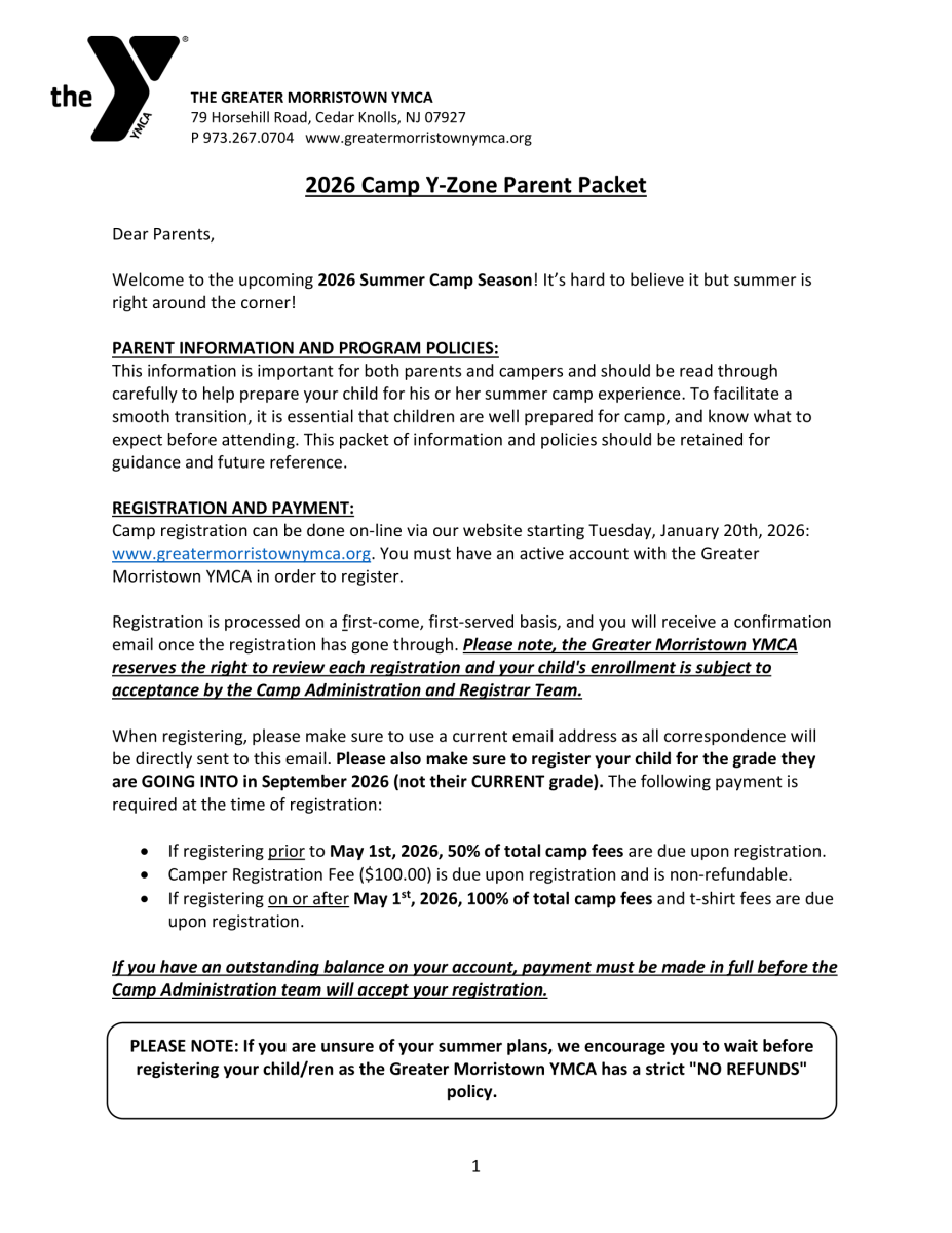PLEASE NOTE: The Greater Morristown YMCA has a strict “no refunds” policy. When registering your child, you will be directed to acknowledge this policy electronically before your child's registration is accepted. We strongly encourage you to wait to register your child/ren until you have finalized your summer vacation plans.